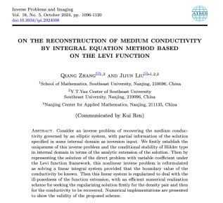 近日,Inverse Problems and Imaging(IPI)发布了2024–2025年高被引论文精选榜单。博彩网 青年教师张嫱(博士)与东南大学博彩网 刘继军教授合作完成的研究论文:On the reconstruction of medium conductivity by integral equation method based on the Levi function 成功入选该榜单,标志着该成果在反问题与成像领域获得了广泛关注与认可。